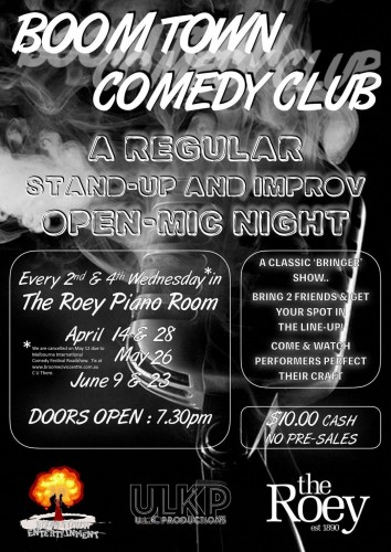 Boom Town is an open mic comedy night every second and fourth Wednesday of the month (except 12 May when we're all going to the Melbourne Comedy Fest.) at the Roey Piano Bar (there is no piano in the room but that’s the name). If you have three minutes of comedy and you’d like to give it a go we want you. Simply bring two friends to cheer yyouou on and we’ll get you in the lineup. (Hint: get your friends really drunk and they will laugh at anything). If you just want to see the show then come on down (Hint: get really drunk and will laugh at anything).